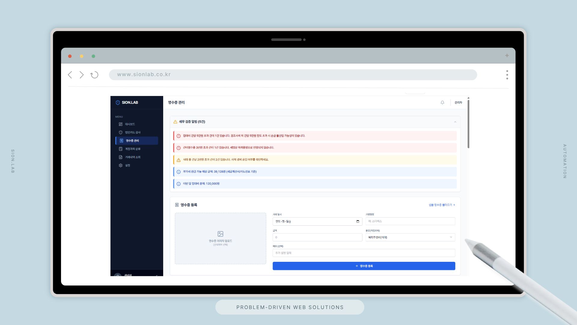 시온랩은 거래 입력의 부담을 줄이는 것을 최우선 과제로 삼았습니다. AI가 거래 내역을 분석하여 계정과목을 자동 추천하고, 축적된 데이터를 기반으로 신고 자료와 재무제표를 자동 생성합니다.