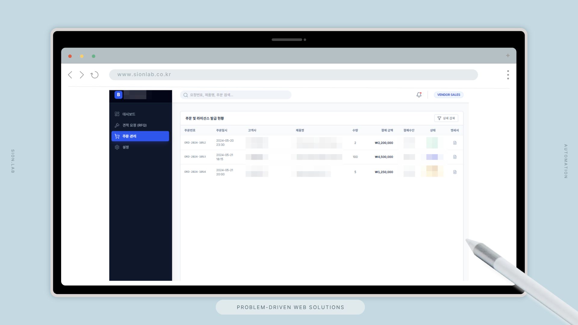 상단 통합 검색바에서 요청번호·제품명·주문 검색이 지원되어, 파트너사가 필요한 정보를 즉시 찾을 수 있도록 설계했습니다. VENDOR SALES 모드 전환으로 파트너 유형에 맞는 화면을 제공합니다.