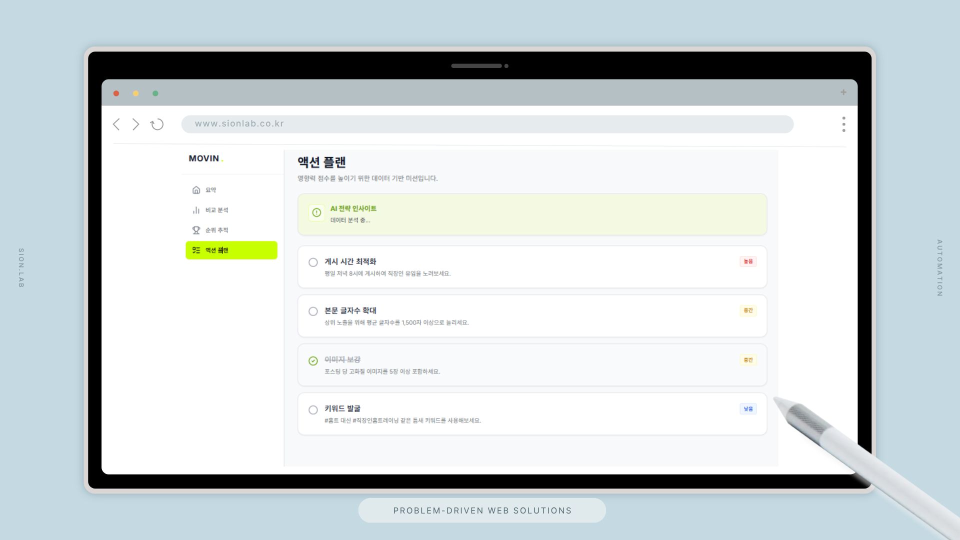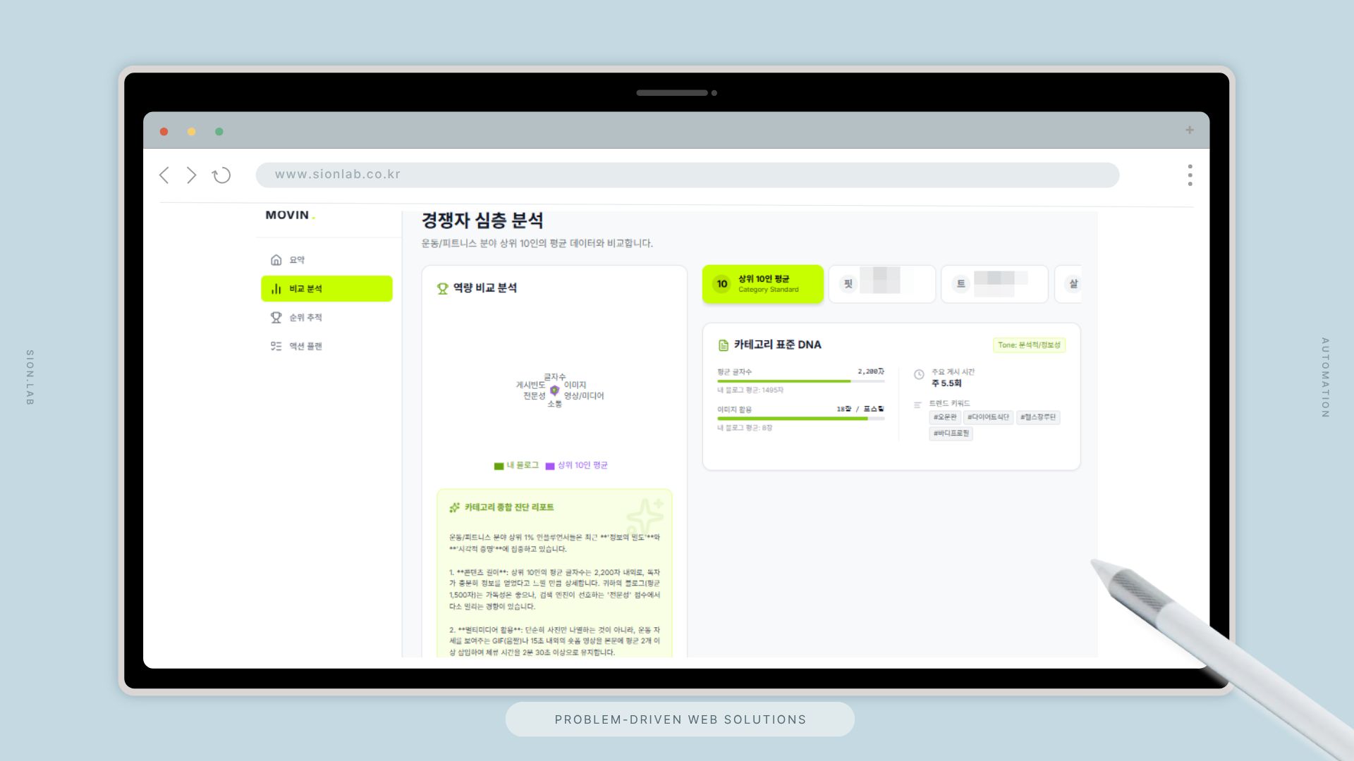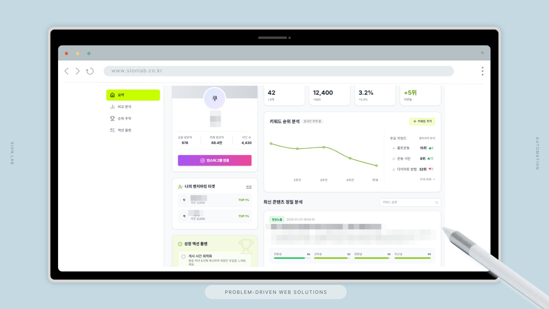 시온랩은 블로그 콘텐츠를 자동 수집·분석하고, 상위 인플루언서와 비교 벤치마킹 후 AI 기반 성장 액션 플랜까지 제공하는 블로거 전용 데이터 분석 플랫폼을 설계·구축했습니다.