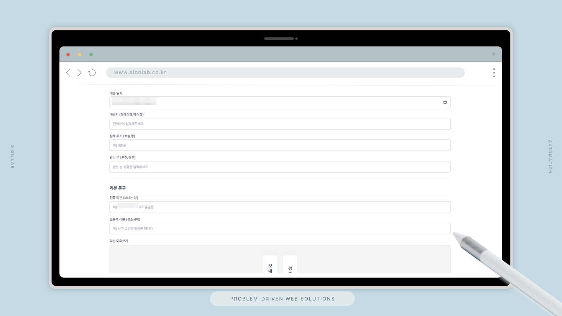 - 리본 문구 설정 및 주문 폼 — 배송 일시, 배송지(장례식장/예식장 검색), 상세 주소, 받는 분(조우/상주) 정보를 입력한 뒤 왼쪽 리본(보내는 분)과 오른쪽 리본(경조사어)을 직접 입력합니다. 리본 미리보기로 실물 느낌을 확인할 수 있어, 경조사어 혼동이나 보내는 분 정보 누락 같은 실수를 사전에 방지합니다.