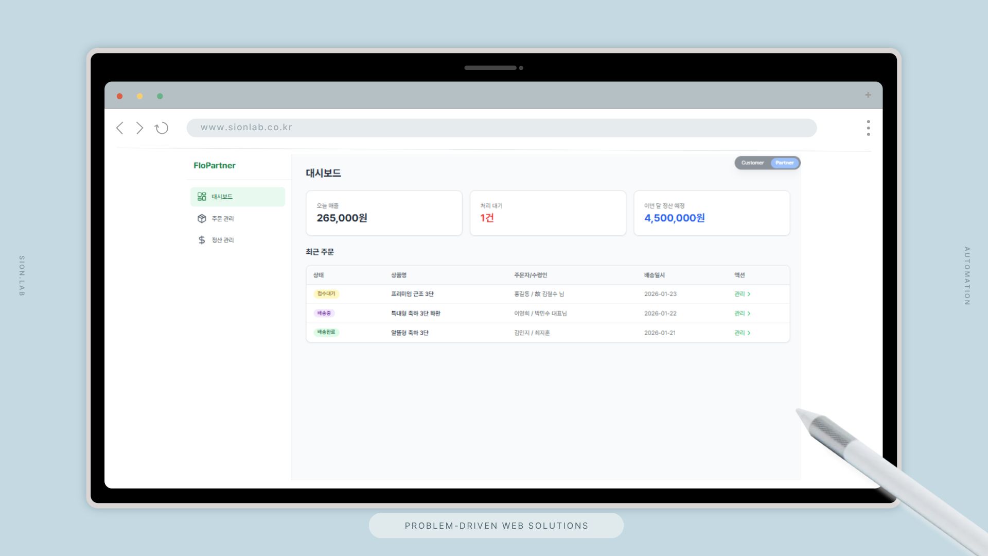 시온랩은 **고객용 모바일 주문 프론트(FloWreath)**와 파트너 화원사용 어드민(FloPartner) 두 개의 서비스를 하나의 백엔드로 통합한 양면 플랫폼을 설계·구축했습니다.