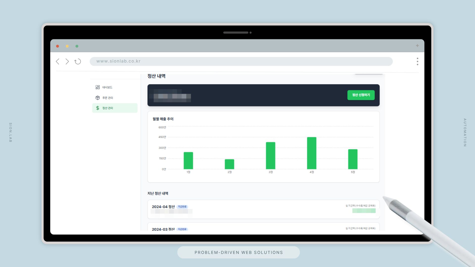 - 정산 내역 투명 관리 — 월별 매출 추이 차트로 매출 흐름을 시각적으로 파악하고, 지난 정산 내역에서 월별 정산 금액과 지급완료 상태를 확인합니다. 정산 신청하기 버튼으로 직접 정산을 요청할 수 있어, 수기 장부 없이 시스템에서 자동 집계된 데이터를 투명하게 조회합니다.