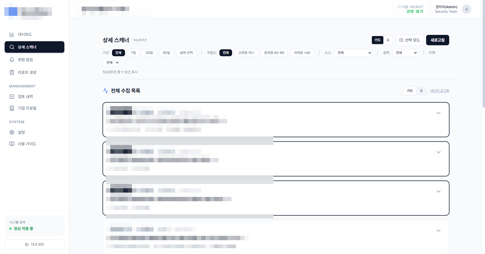 - 상세 스캐너 — 수집된 전체 공고를 기간, 위험도, 소스, 경력, 지역 등 다양한 조건으로 필터링하고 검색합니다. 카드 뷰와 테이블 뷰를 전환할 수 있어 목적에 따라 효율적으로 탐색할 수 있습니다.