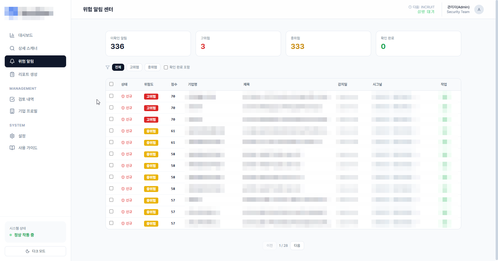 - 통합 대시보드 — 전체 수집 현황, 데이터 품질, 위험 등급 분포, 위험 점수 TOP 10을 한 화면에서 파악합니다. 시스템 상태와 수집 추이를 실시간으로 확인할 수 있습니다.