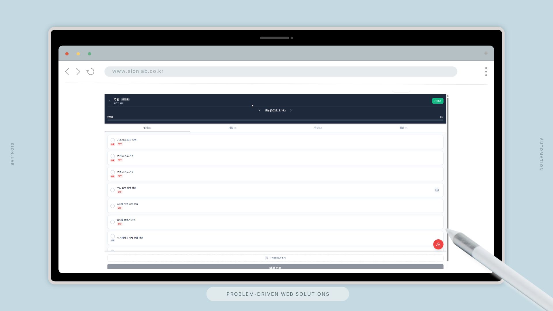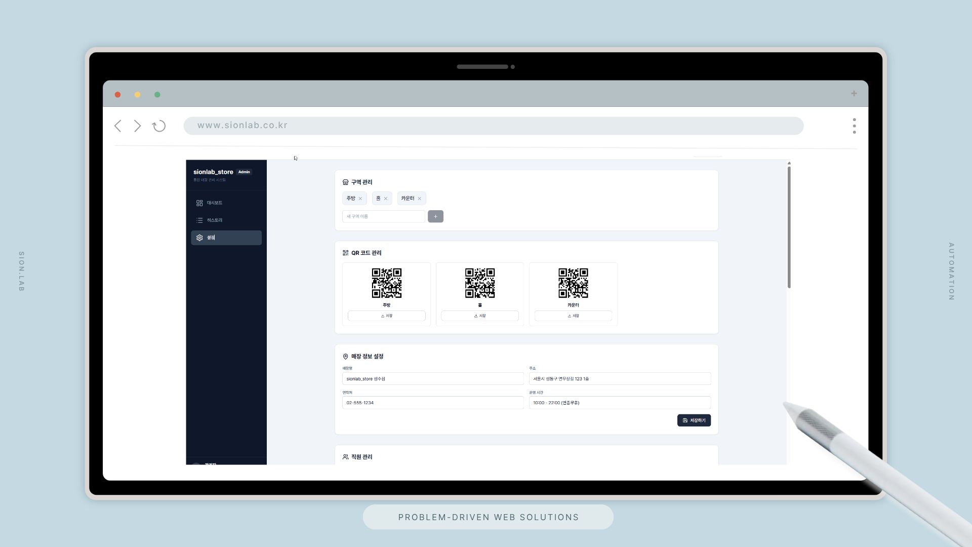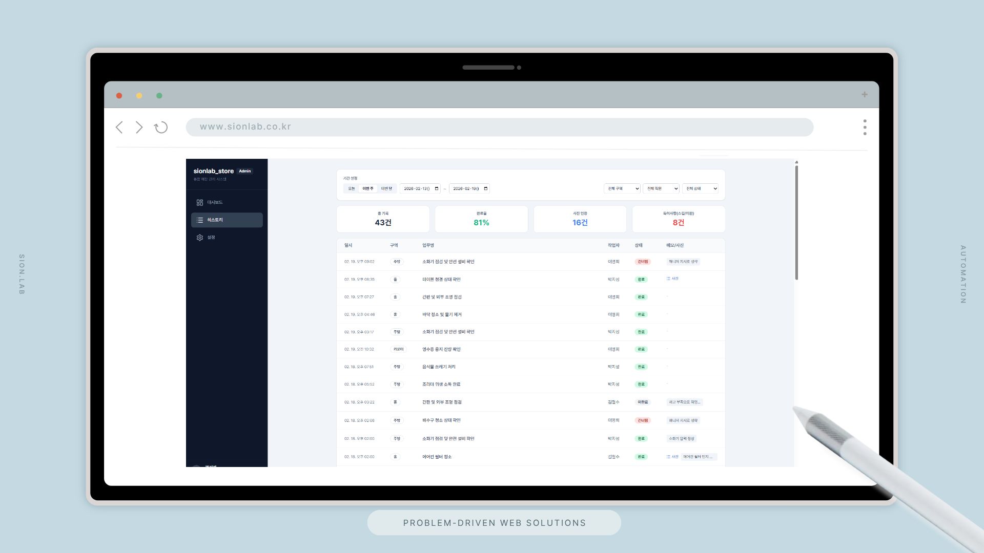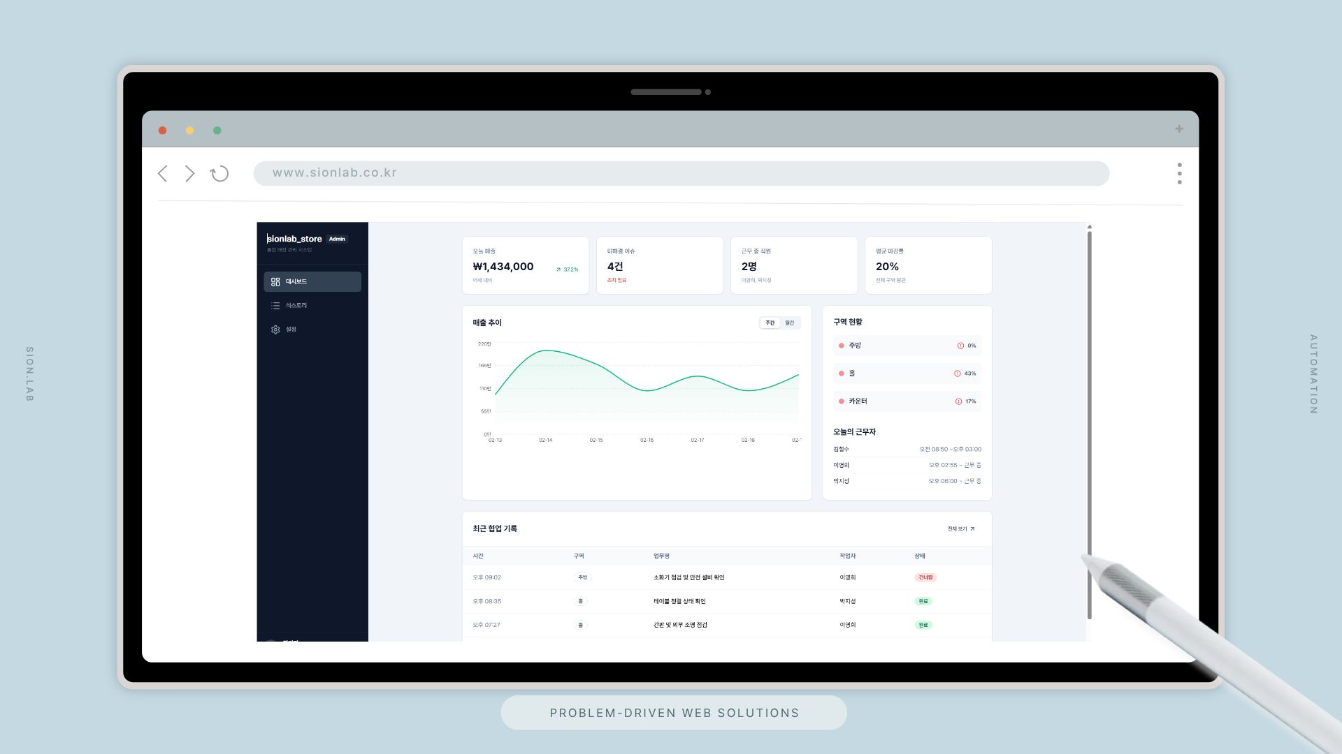 시온랩은 POS에서 발생하는 데이터를 실시간으로 연동하여, 매출·재고·근태를 하나의 관리 화면에서 즉시 파악할 수 있는 통합 플랫폼을 설계했습니다. 재고 알림과 급여 정산은 시스템이 자동으로 처리합니다.